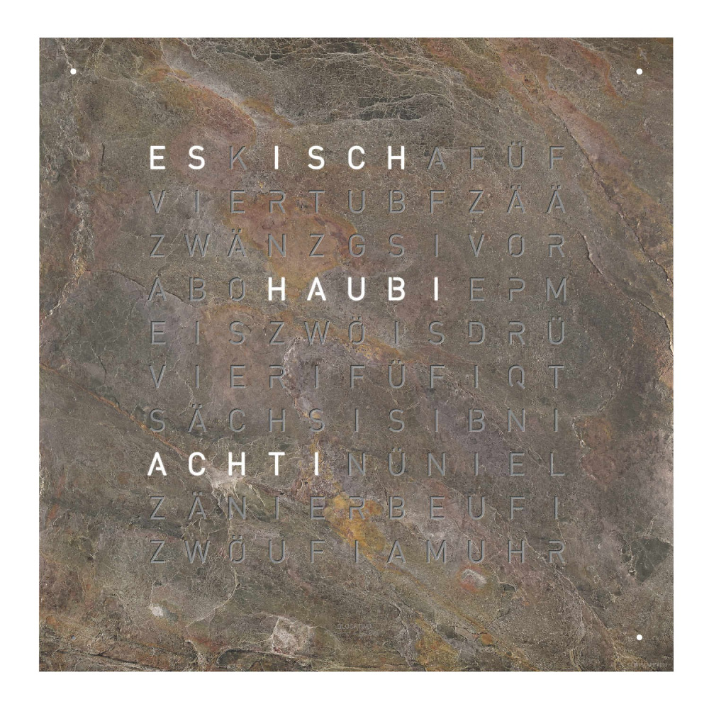 QLOCKTWO EARTH 45 verfügt über ein auswechselbares Frontcover GLINTSCAPE aus Millionen Jahre altem Sedimentgestein. Das Frontcover der QLOCKTWO EARTH 45 wird von Magneten gehalten. Daher kann dieses für einen Farb- oder Sprachwechsel ohne Werkzeug schnell und problemlos ausgewechselt werden: