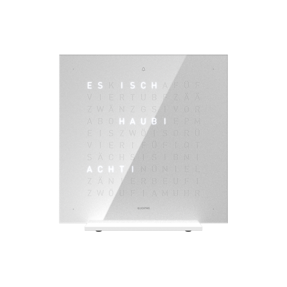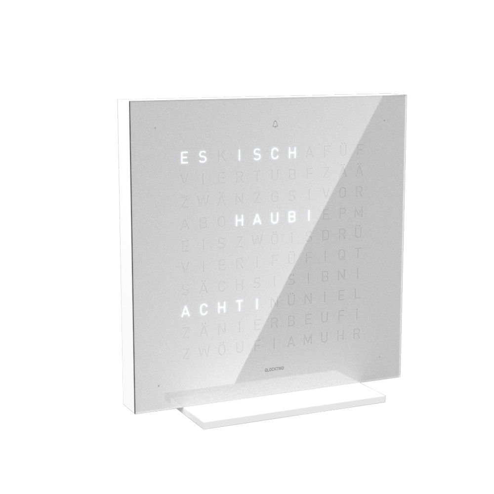 2. Setzen Sie anschliessend das neue Frontcover passgenau auf den Korpus auf.Dies erlaubt es Ihnen, der Uhr jederzeit ein neues Gesicht zu verpassen, da die Frontabdeckungen separat erworben werden können (einzige Ausnahme ist die Front in arabischer Sprache). Damit ist sichergestellt, dass die Uhr auch noch in 10 Jahren mit Ihrem Interieur harmoniert und letztlich wahrhaftig zeitlos wird. Mittlerweile ist die Qlocktwo als Wanduhr in 23 Sprachen erhältlich. Besonders stolz sind wir natürlich auf die Variante in Schweizerdeutsch (Berndeutsch), die auf unser Hinwirken realisiert wurde. Achtung: Der im Lieferumfang enthaltene Acryl Standfuss kann für diese Ausführung nicht verwendet werden, da er die behandelte Oberfläche der Front beschädigen könnte.