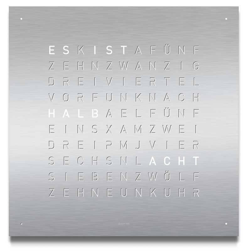 OHNE ZEIGER. OHNE ZIFFERN.Die QLOCKTWO EARTH ist eine Hommage an das einzigartige Kulturgut Zeit und unseren Planeten. Sie zeigt die 24 Stunden eines Tages auf einer Wortmatrix in den Sprachen unserer Welt an. Das Frontpanel der QLOCKTWO EARTH 45 STAINLESS STEEL aus gebürstetem Edelstahl gibt dem Kunstobjekt durch das pure und kompromisslose Material einen klaren Raum zur Wirkung. Sie lenkt in keiner Weise ab und fokussiert auf das Wesentliche. Durch den gekonnten Einsatz von Farben und Perspektiven im Umfeld tritt die EARTH 45 STAINLESS STEEL in einen einzigartigen Dialog. Denn mit ihrer vermeintlich kühle Optik nimmt sie durch Lichtreflexe die Farbigkeit und Wärme der Umgebung auf und verschmilzt mit ihr. Die 45 x 45 cm grosse EARTH 45 verleiht, ob an der Wand oder am Standfuss, jedem Raum ein einzigartiges, edles Ambiente.