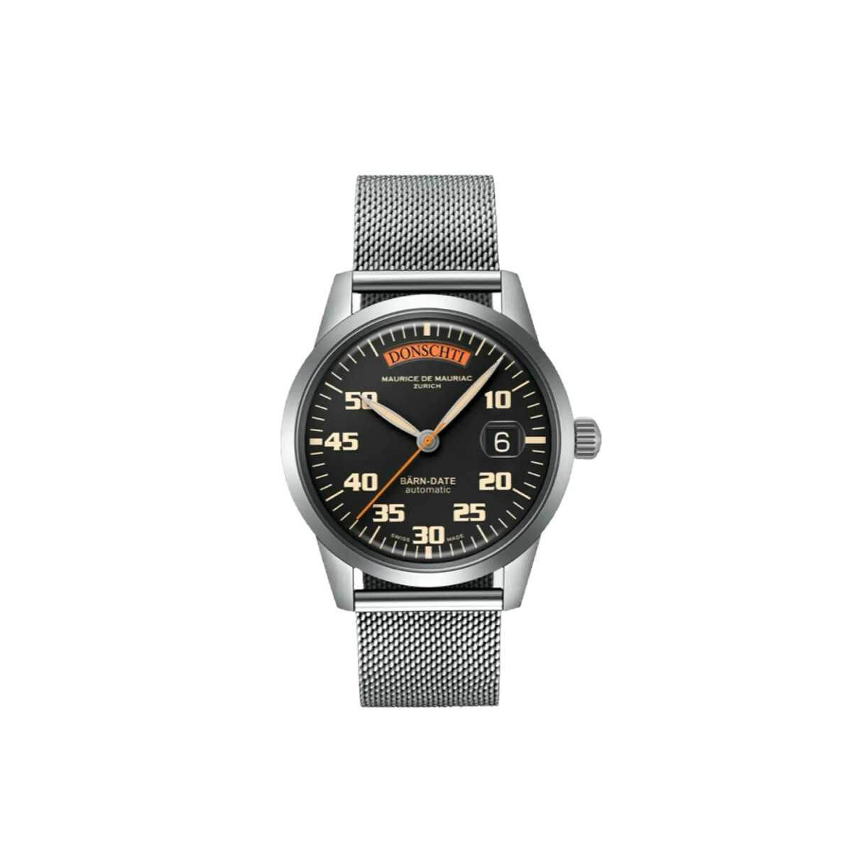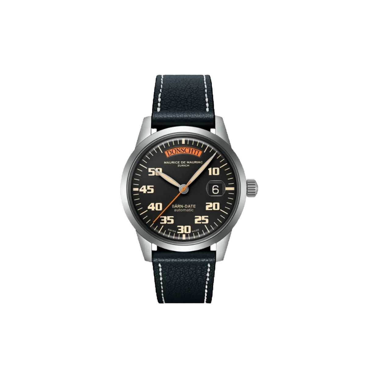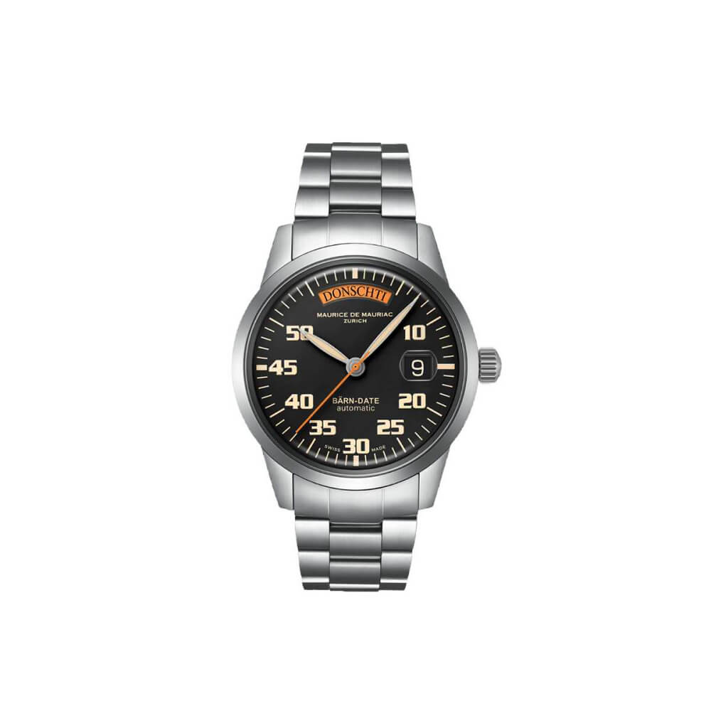 Marke MAURICE DE MAURIAC Modell BÄRN-DATE: Uhrsachen Edition - Limitiert auf 50 Exemplare Referenz MDM.130.BärnDate.UR Dimensionen 42mm Materialien Gehäuse aus satiniertem Edelstahl, schwarzes Zifferblatt mit Sekundenzeiger und Wochentags-Anzeige in UhRSACHEN-Orange, geschützt durch ein blau entspiegeltes Saphirglas, Saphirglas-Sichtboden. Folgende Armbandmöglichkeiten stehen zur Auswahl: Lederband mit Dornschliesse aus Edelstahl, Edelstahl-Milanaiseband mit Sicherheitsschliesse oder Edelstahlband mit Drückerfaltschliesse. Uhrwerk Mechanisches Uhrwerk, ETA-Kaliber 2834 mit automatischem Aufzug Funktionen Anzeige der Stunden, Minuten und Sekunden inkl. Wochentags- und