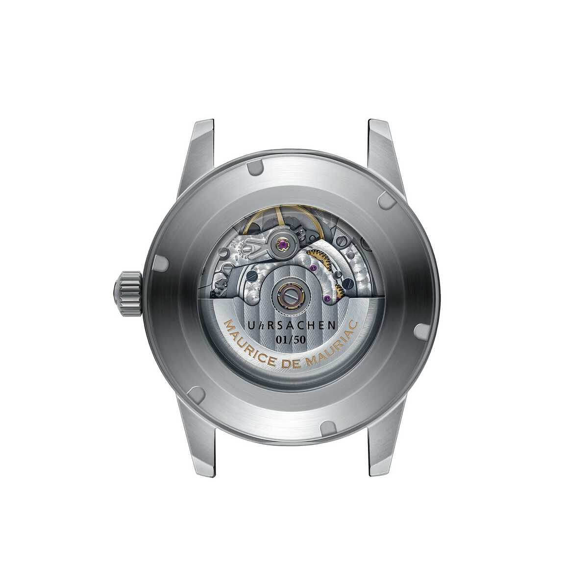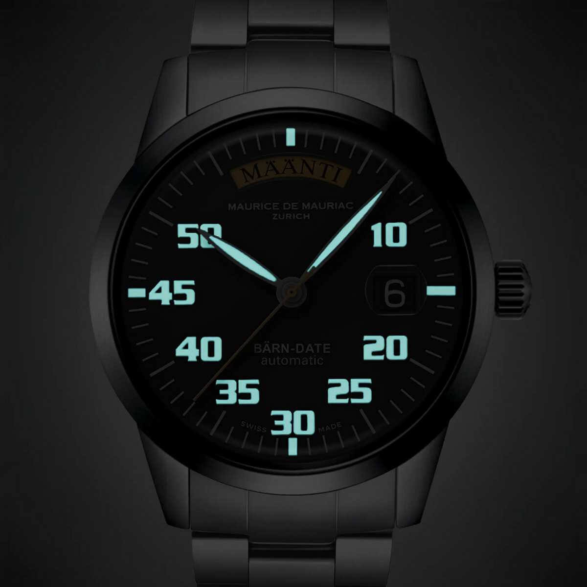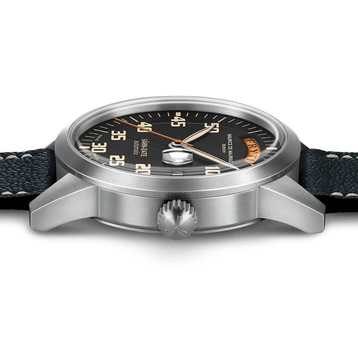 Marke MAURICE DE MAURIAC Modell BÄRN-DATE: Uhrsachen Edition - Limitiert auf 50 Exemplare Referenz MDM.130.BärnDate.UR Dimensionen 42mm Materialien Gehäuse aus satiniertem Edelstahl, schwarzes Zifferblatt mit Sekundenzeiger und Wochentags-Anzeige in UhRSACHEN-Orange, geschützt durch ein blau entspiegeltes Saphirglas, Saphirglas-Sichtboden. Folgende Armbandmöglichkeiten stehen zur Auswahl: Lederband mit Dornschliesse aus Edelstahl, Edelstahl-Milanaiseband mit Sicherheitsschliesse oder Edelstahlband mit Drückerfaltschliesse. Uhrwerk Mechanisches Uhrwerk, ETA-Kaliber 2834 mit automatischem Aufzug Funktionen Anzeige der Stunden, Minuten und Sekunden inkl. Wochentags- und