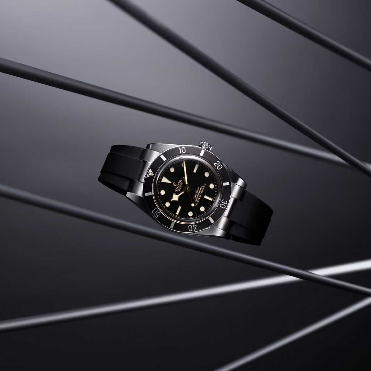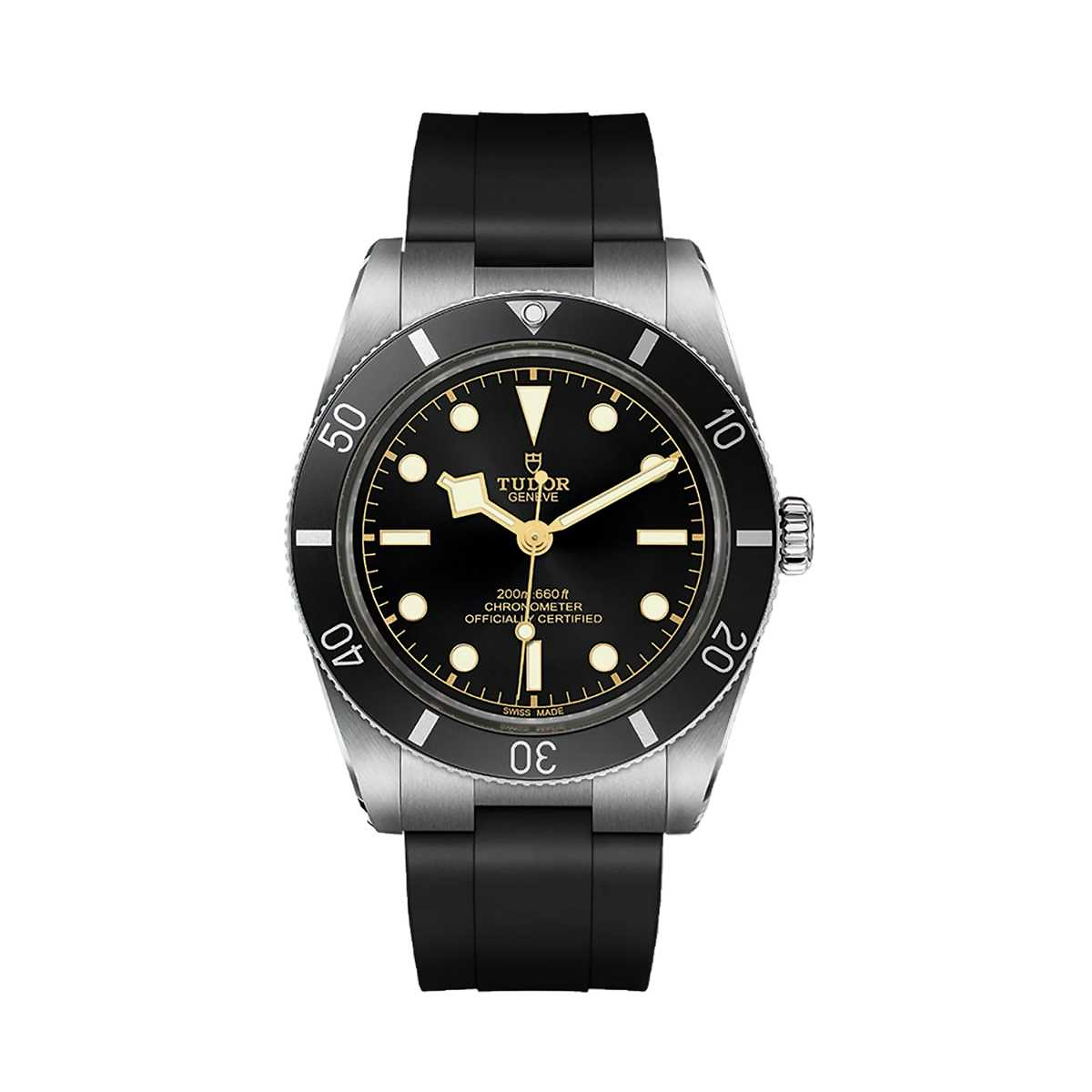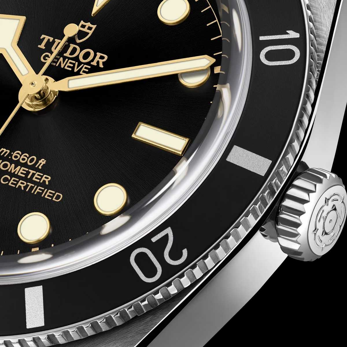 Materialien Gehäuse und einseitig drehbare Lünette aus Edelstahl mit schwarzem Inlay aus Aluminium, schwarzes Zifferblatt, geschützt durch ein Saphirglas, begleitet von einem Uhrband aus schwarzem Kautschuk mit TUDOR "T-fit" Faltschliesse aus Edelstahl
