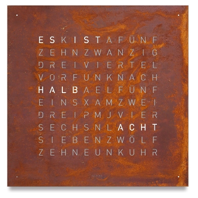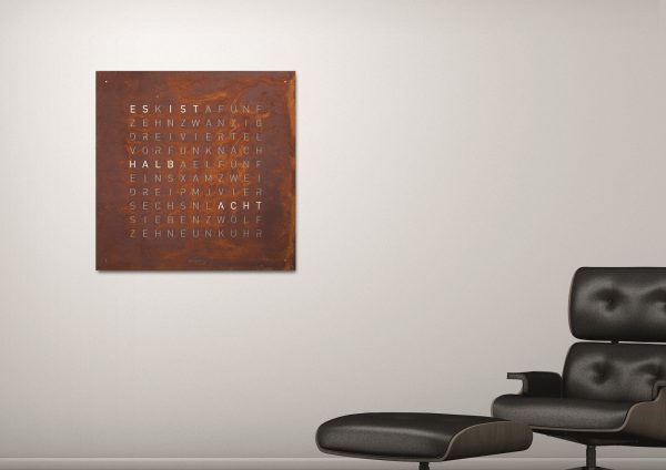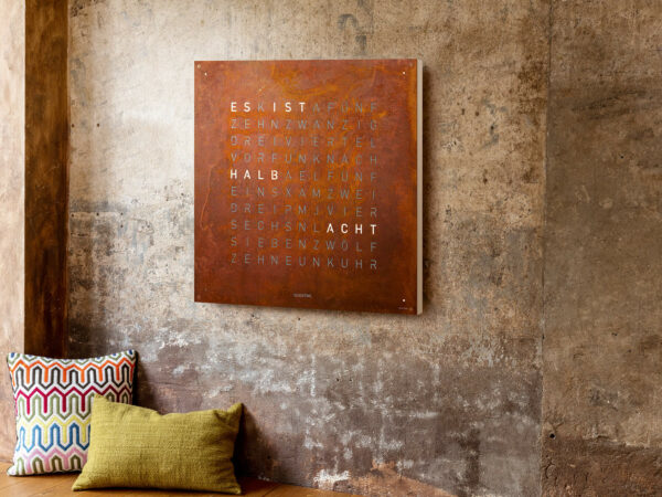 – QLOCKTWO EARTH 90 mit Frontcover aus gerostetem Stahl (fixiert)