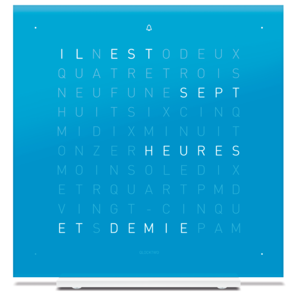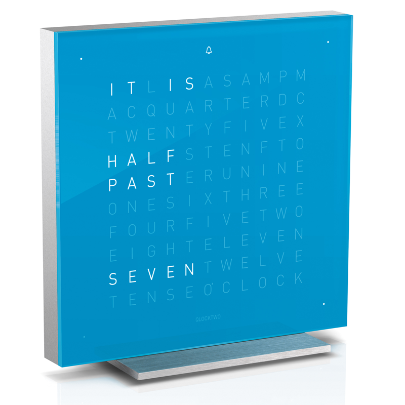 QLOCKTWO EARTH 13.5 ist eine Präzisionstischuhr mit Alarmfunktion im Format 13.5 x 13.5 cm. Die Uhrzeit wird in Fünf-Minuten-Schritten dargestellt, vier kleine Punkte sorgen für die exakte Minutenanzeige. Ein kompakter und ästhetischer Zeitmesser mit Alarmfunktion für Büro, Wohn- und Schlafbereich.