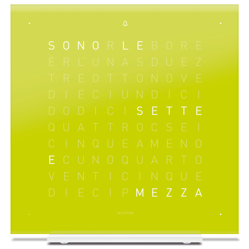 QLOCKTWO EARTH 13.5 ist eine Präzisionstischuhr mit Alarmfunktion im Format 13.5 x 13.5 cm. Die Uhrzeit wird in Fünf-Minuten-Schritten dargestellt, vier kleine Punkte sorgen für die exakte Minutenanzeige. Ein kompakter und ästhetischer Zeitmesser mit Alarmfunktion für Büro, Wohn- und Schlafbereich.